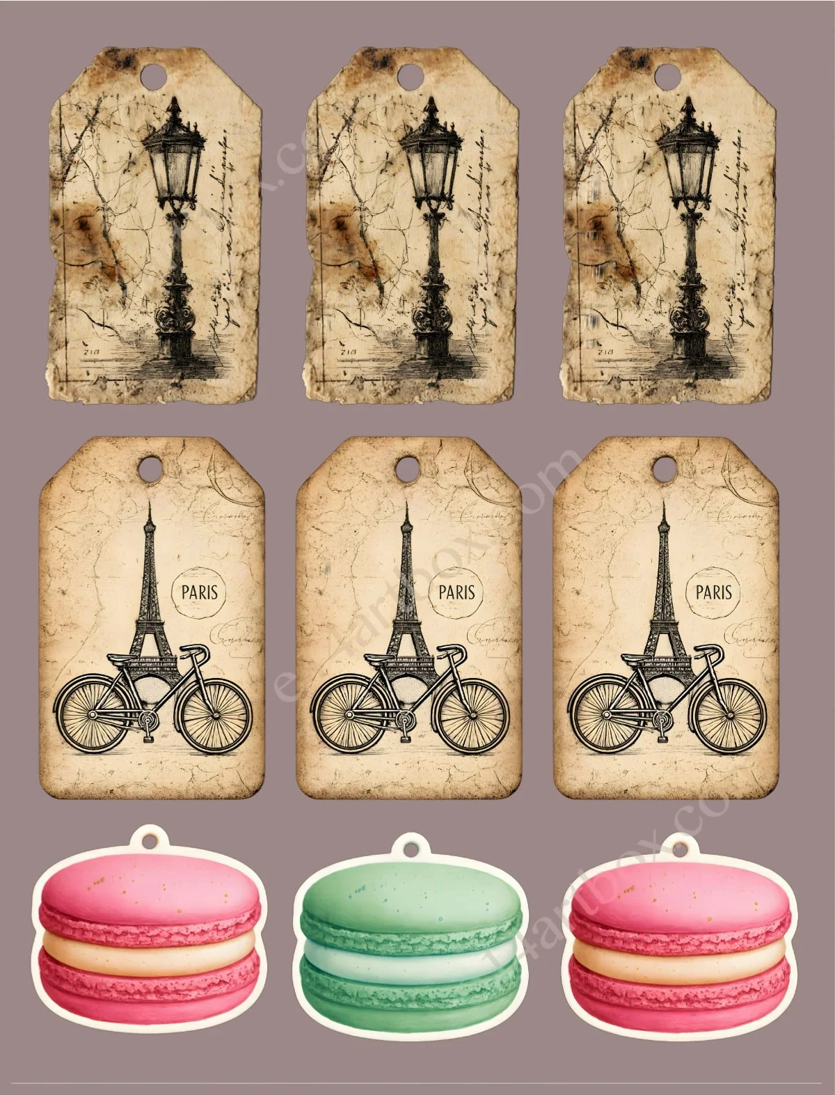 Boutique Ephemera: A rich selection of designer luggage tags, gift labels, and "washi tape" strips featuring macarons, sunflowers, and vintage French postmarks.