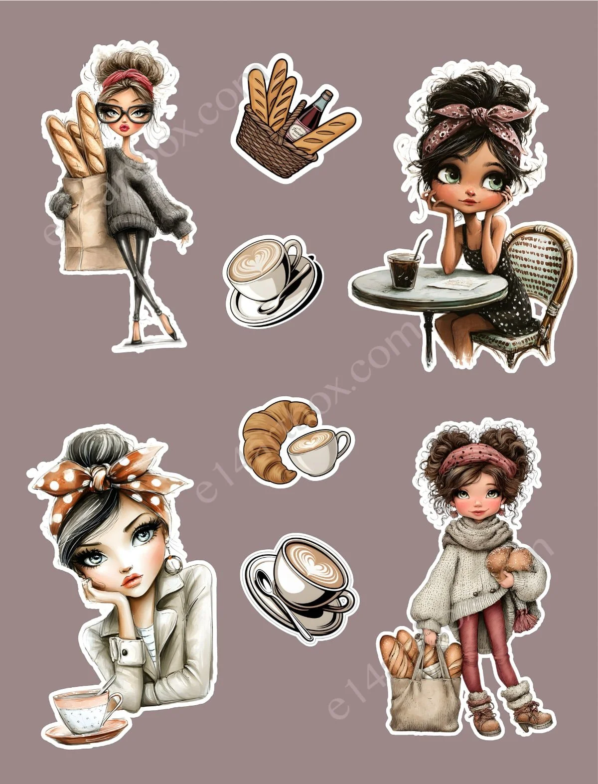 The «Mademoiselle» Clipart: Dozens of isolated, sticker-style graphics of our stylish Parisian muse. From chic trench coats and red berets to pigtails and pearls, these characters are ready to be "fussy cut" and layered into your designs.