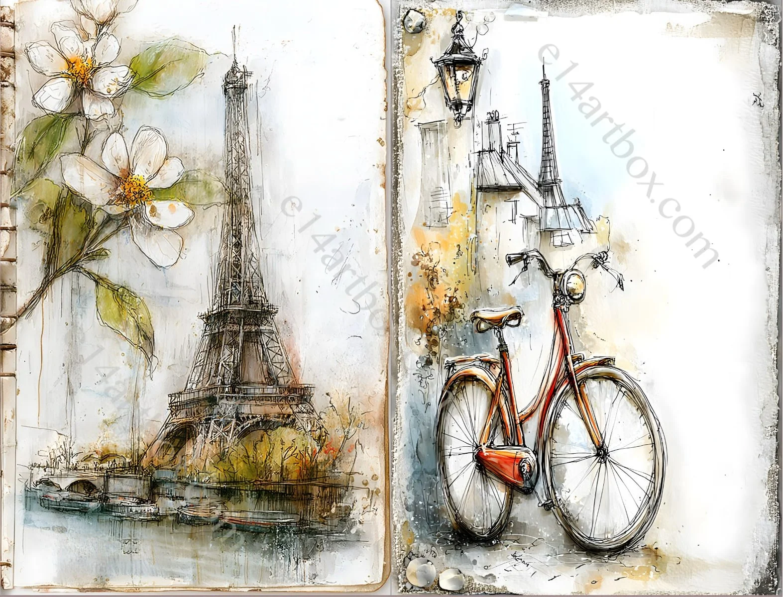Stunning Backgrounds: Full-page artistic textures ranging from soft, misty watercolor rooftops to thick, tactile impasto oil paintings of the Eiffel Tower and cozy sidewalk cafes.